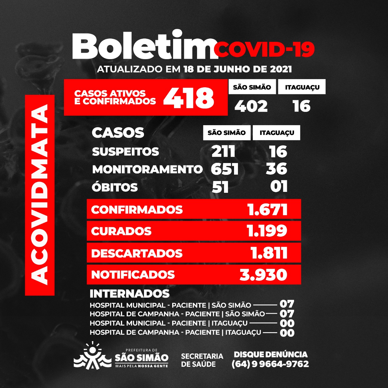Boletim Epidemiológico Coronavírus n.º 169- 18/06/2021 – São Simão e Itaguaçu.