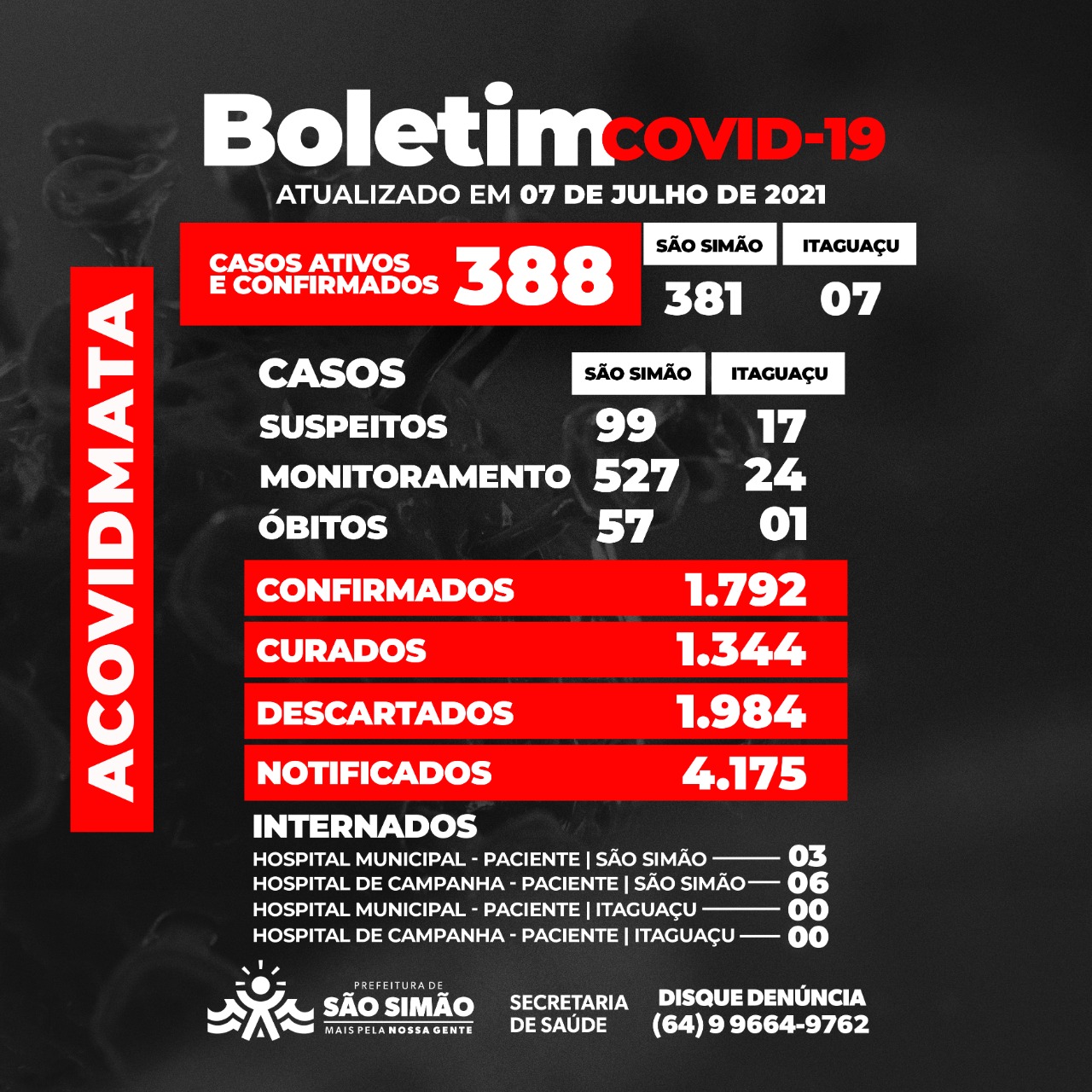 Boletim Epidemiológico Coronavírus n.º 187- 07/07/2021 – São Simão e Itaguaçu.