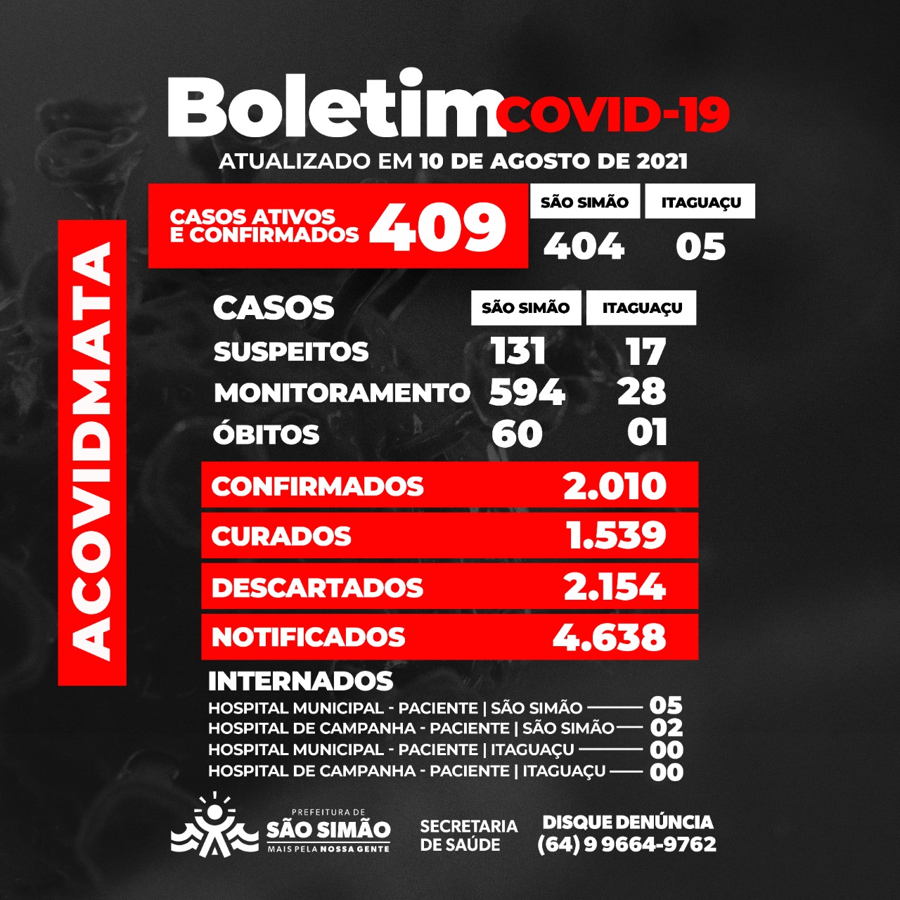 Boletim Epidemiológico Coronavírus n.º 220-10/08/2021 – São Simão e Itaguaçu.