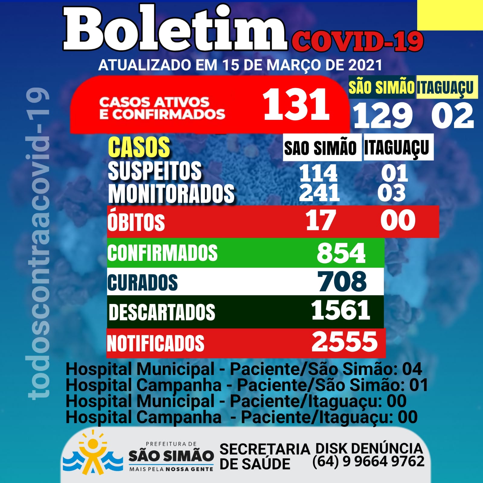 Boletim Epidemiológico Coronavírus n.º 73- 15/03/2021 – São Simão e Itaguaçu.