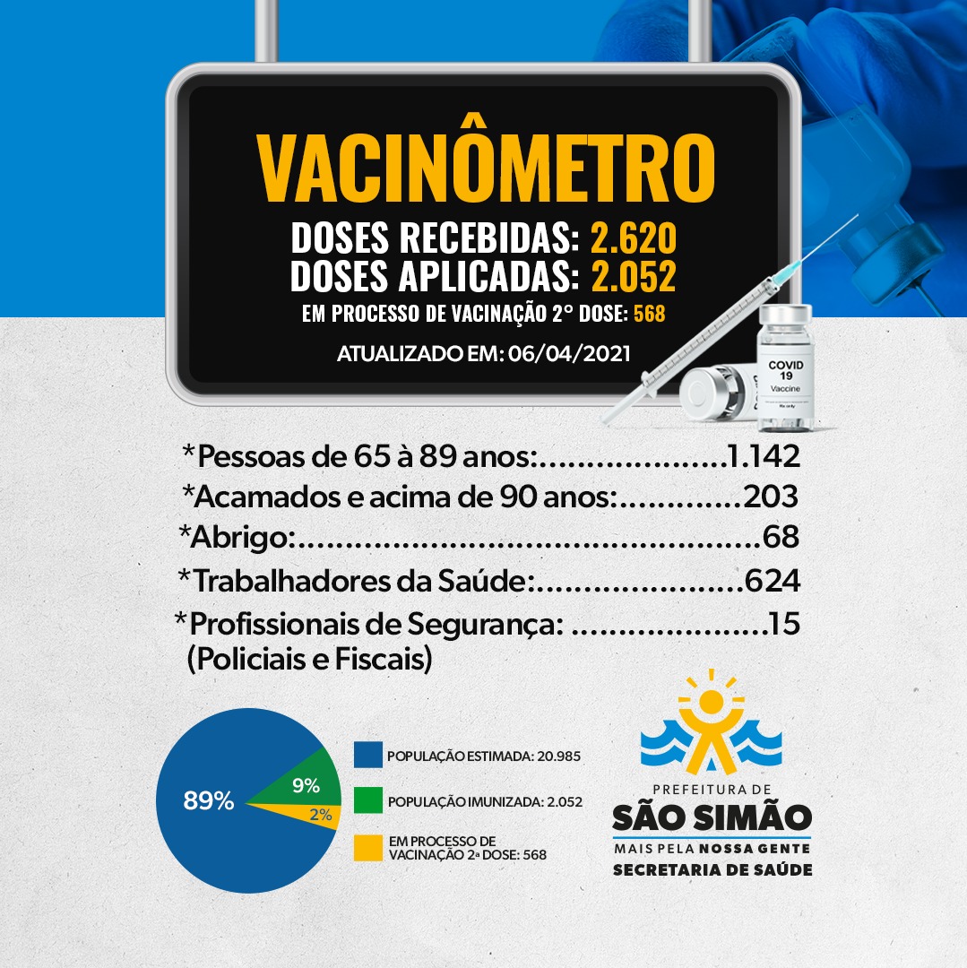 Início » Boletim Covid-19 » Boletim Vacinômetro n.°06- 06/04/2021 São Simão e Itaguaçu. *Sujeito a alterações conforme a chegada de novas doses e atualização do número imunizados.