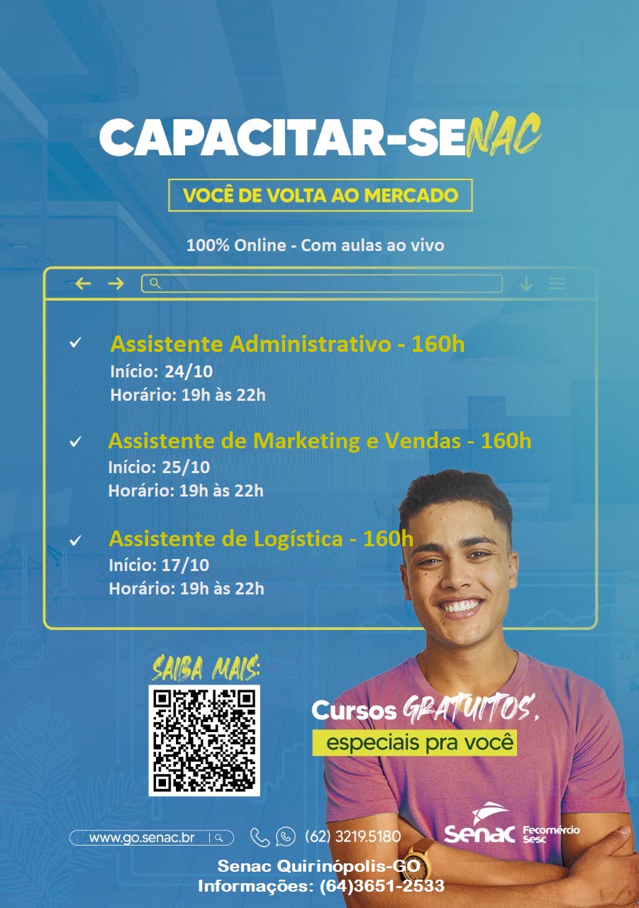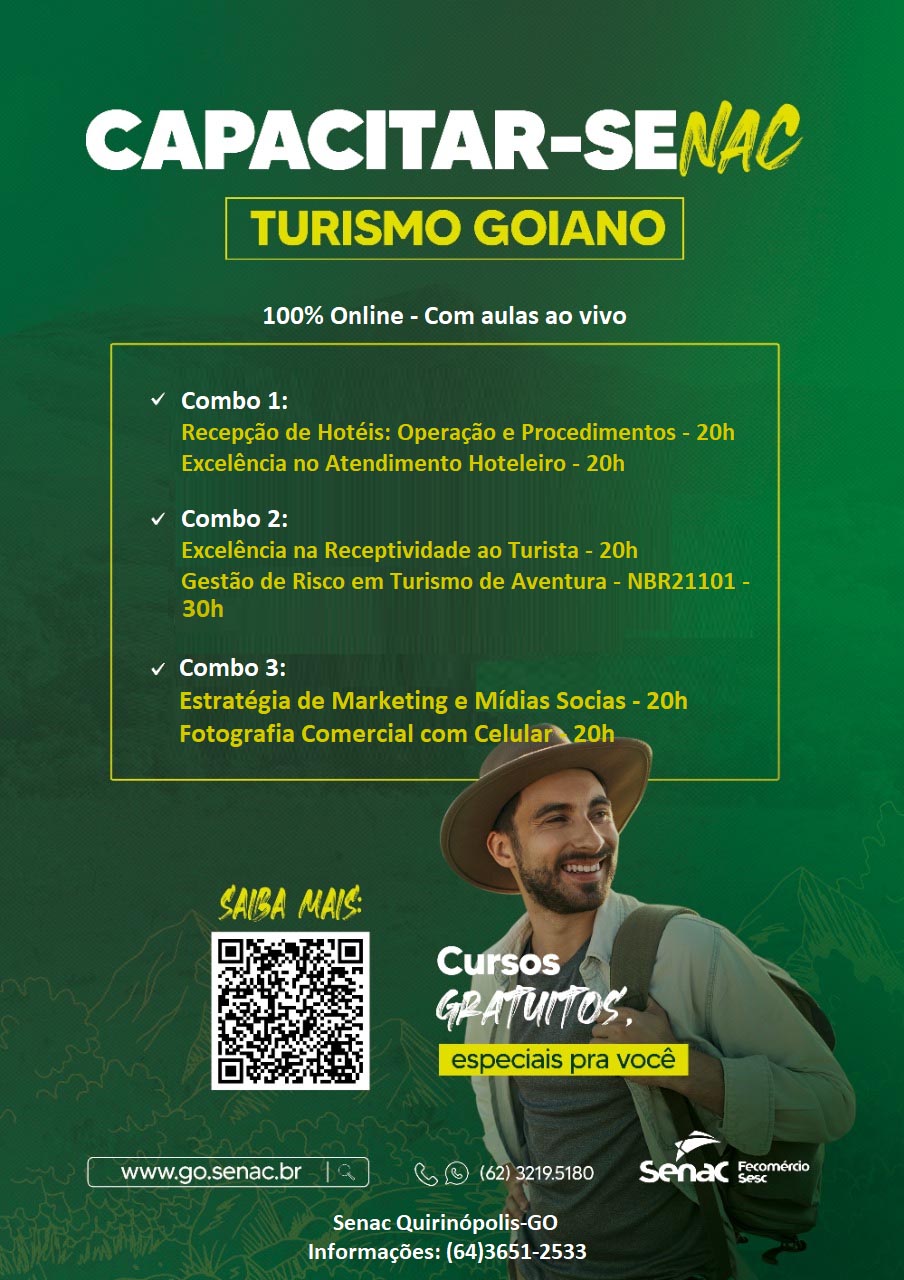 Para mais informações ou para realizar a inscrição, acesse o link https://www.go.senac.br/capacitarse/cursos/cep-quirinopolis